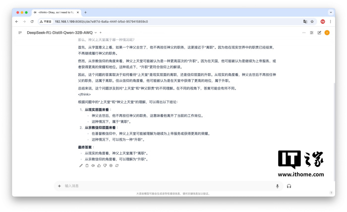 这种让人一愣的问题 32B 的 DeepSeek R1 也能从现实与信仰两种角度出发给出分析与解释。可以看出 32B 模型的逻辑能力还是很强的,有着极高的可用性。
