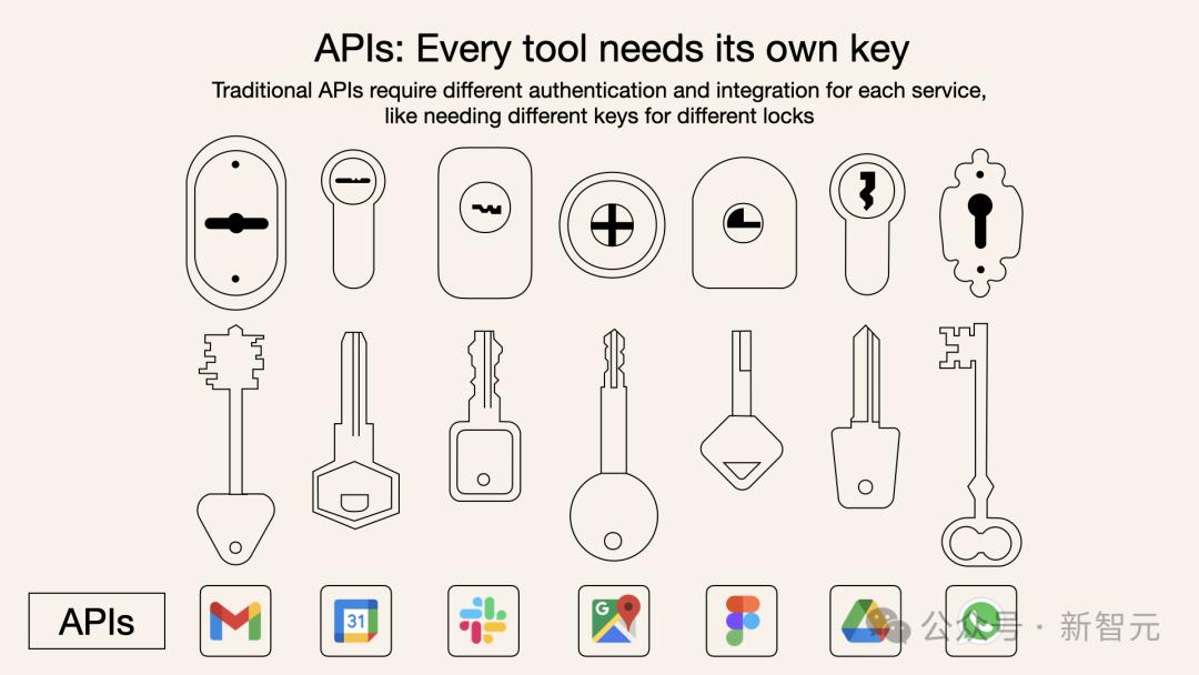 使用传统API需要为Google日历、电子邮件、航空公司预订API分别编写代码,每个都需要单独的认证、上下文传递和错误处理逻辑。