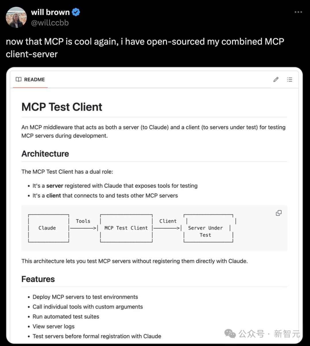 开发者Will Brown开源了MCP Test Client,可以在开发过程中测试MCP服务器时既充当服务器(对Claude而言),又充当客户端(对被测试的服务器而言)。