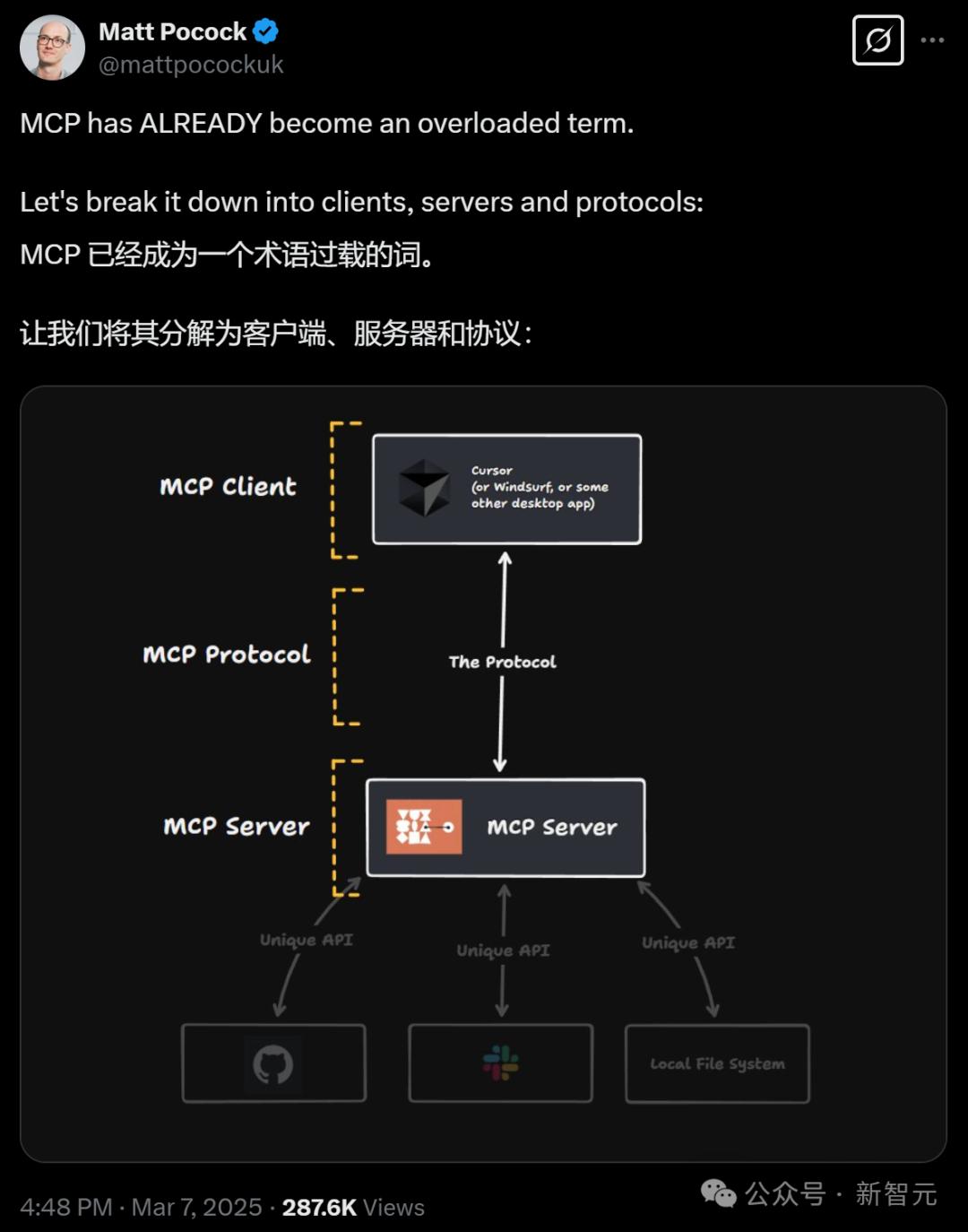 同样,外部工具(比如邮件、天气应用等)也只需搭建一次MCP服务器,之后所有支持MCP的AI助手都可以直接与之交互。