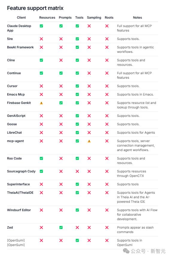 可以看到,Claude Desktop和Continue支持资源、提示、工具,功能很全面。5ire和BeeAI Framework就比较有限,工具支持还可以,但其他方面基本不行。Cline也支持资源和工具,但不支持提示。Cursor和Emacs Mcp主要支持工具,其他功能都不行,适合简单工具操作。