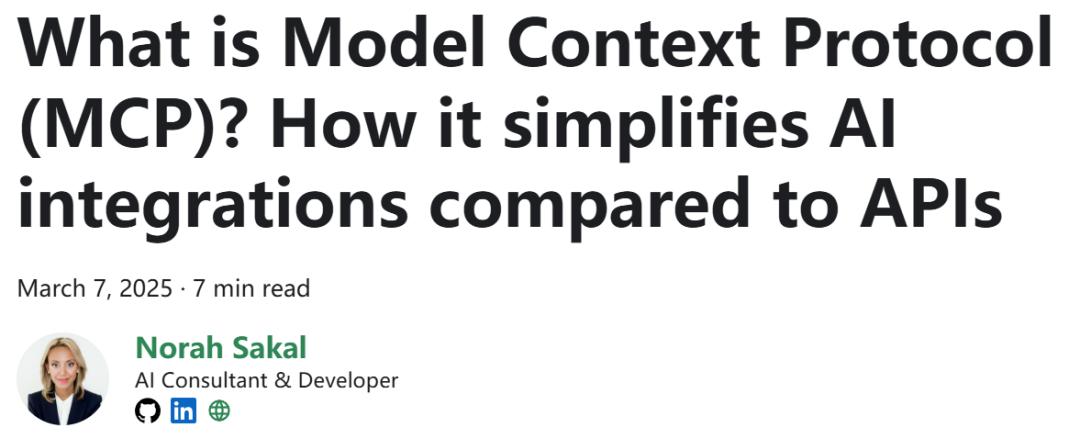 正如前文所说,MCP(Model Context Protocol)是一种新的开放协议,目的是为LLM提供标准化的上下文信息传递方式,从而实现AI智能体与外部数据及工具的结合。