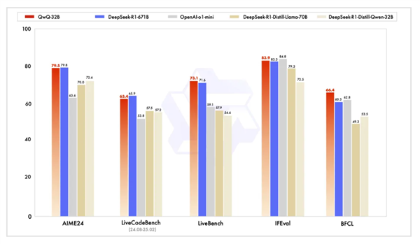 在测试中,QwQ-32B表现远胜于o1-mini及相同尺寸的R1蒸馏模型。