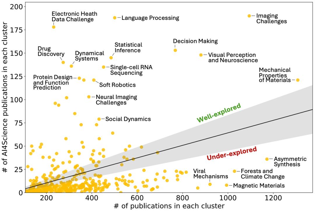 结果显示,AI应用高度集中于少数领域,如蛋白质设计、材料科学、基因组分析。与之相对的是,存在大量科学问题尚未被充分探索,如不对称合成、磁性材料挑战、森林与气候变化等关键领域的AI渗透率不足10%,这些科学问题可能会更多地从采用 AI 方法中受益。