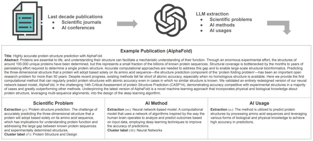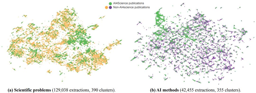 这项研究通过GPT-4o等大语言模型进行语义解析,团队构建了一个包含12.9万科学问题与4.2万AI方法的新数据集,之后经过语义聚类,最终形成390个科学问题簇和355个AI方法簇。这一过程突破了传统分类体系的桎梏,实现了数据驱动的动态映射。