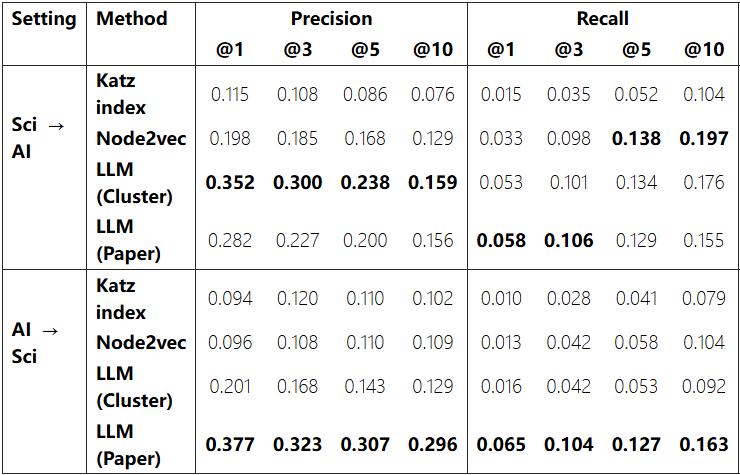 实验表明,基于LLM的链接预测方法在大多数情况下优于传统方法,突显了其在预测 AI4Science 研究方向方面的强大潜力。