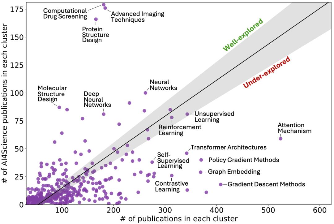 有了上述的AI4Science数据集(图1),就可以将科学问题按照该领域内的论文数量,以及该领域内应用AI的论文数量进行对比,如果这个比例偏低,那么就可以说明这个领域使用AI的进度相对落后。
