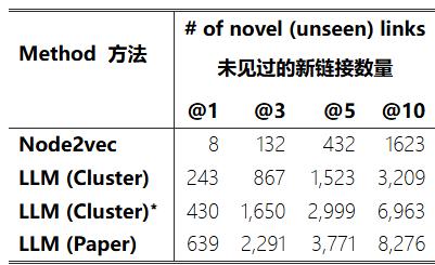 表2:传统方法和基于大模型的方法,使用2014-2022年的数据进行训练,预测模型发现的新链接数量与训练集对比。2023 年和 2024 年真实论文数据引入了 683 个新链接。