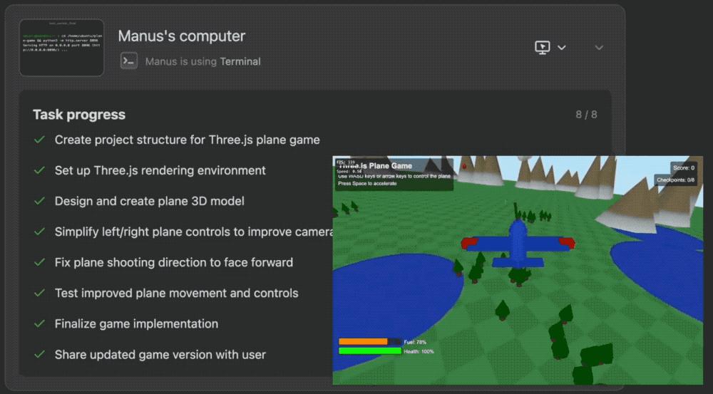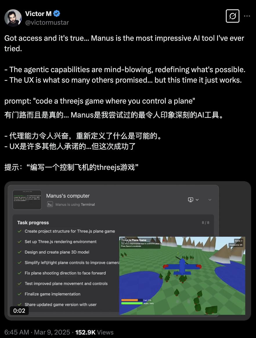 3月9日,Hugging Face产品负责人Victor M体验了用Manus“编写一个控制飞机的threejs游戏”。