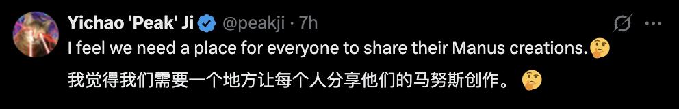 目前,关于Manus的讨论仍在持续发酵,关于Manus的体验用例被持续发布到社交平台上,季逸超发文称或许需要一个专门的地方让每个人都能分享Manus作品。