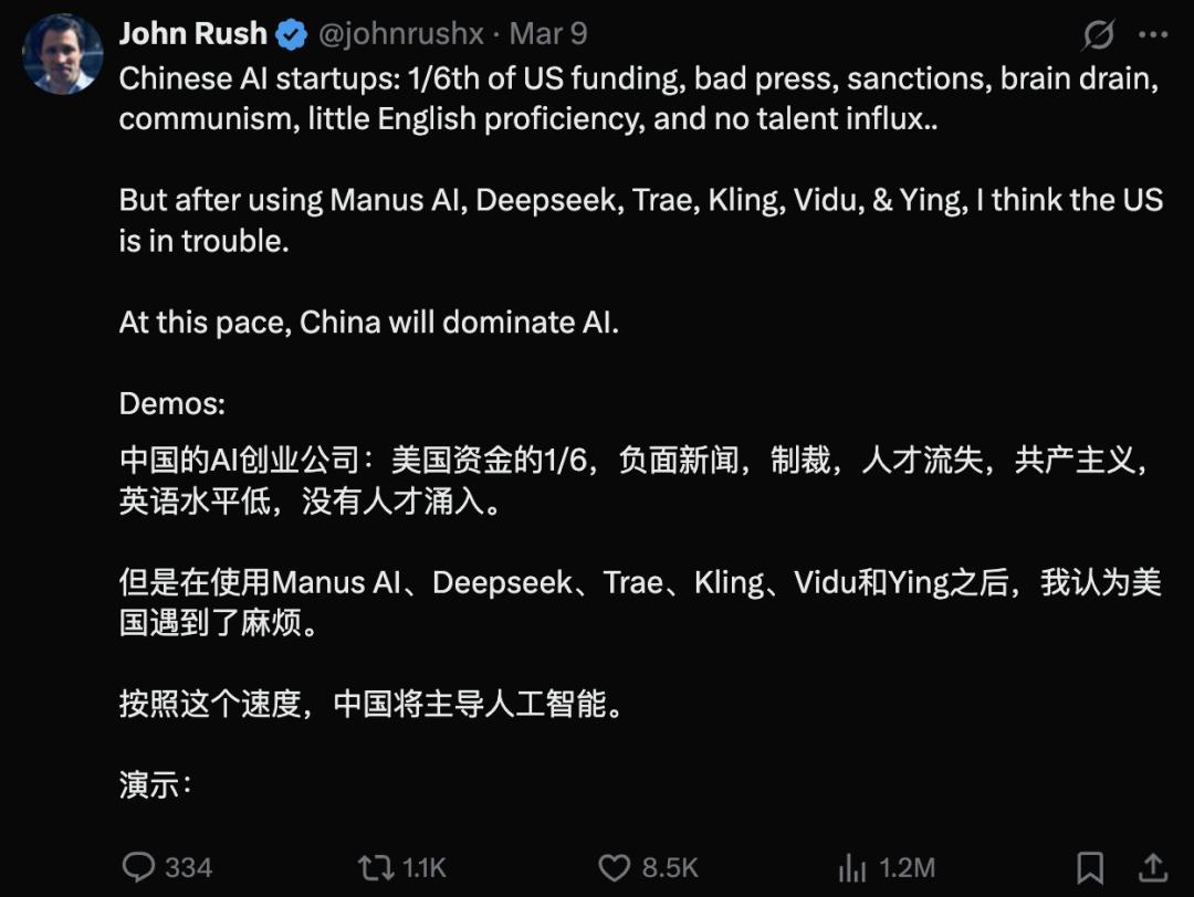 看到Manus的发布,3月9日,知名AI博主John Rush扭转了自己对中美AI发展的看法,认为“按照这个速度,中国将主导人工智能”。