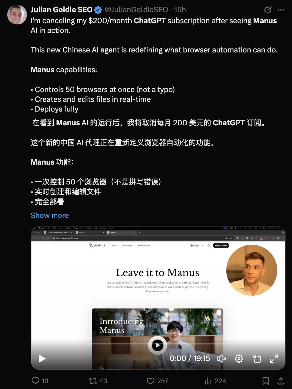 从3月8日至今,YouTube上的AI博主Julian Goldie SEO已经连发四条视频称赞Manus:“看到Manus的运行后,我将取消每月200美元的ChatGPT订阅。”