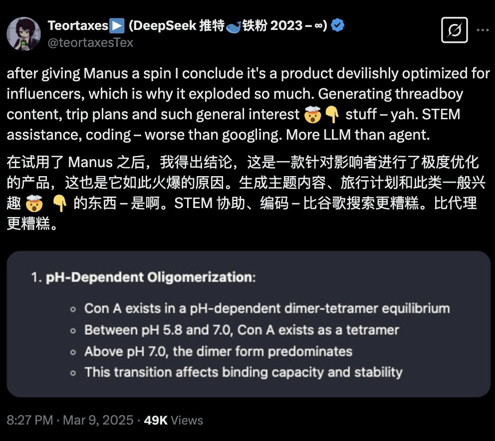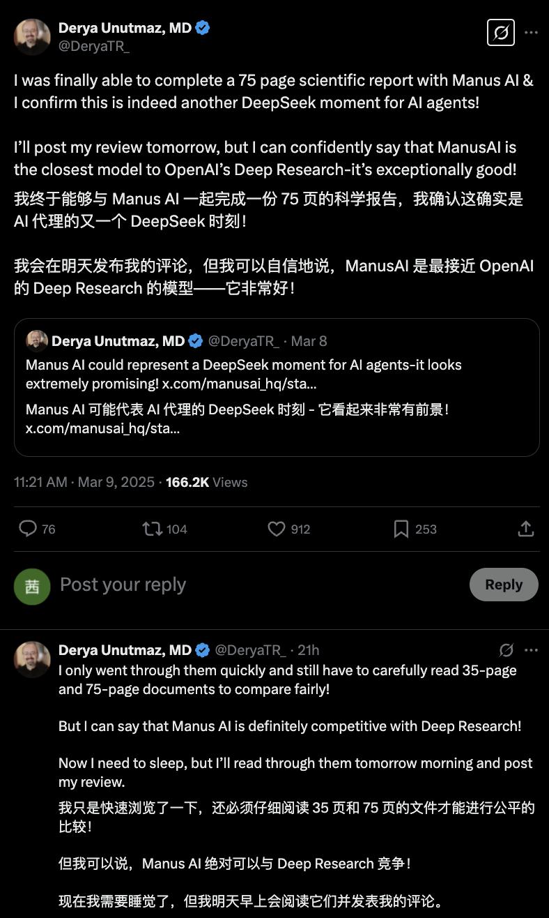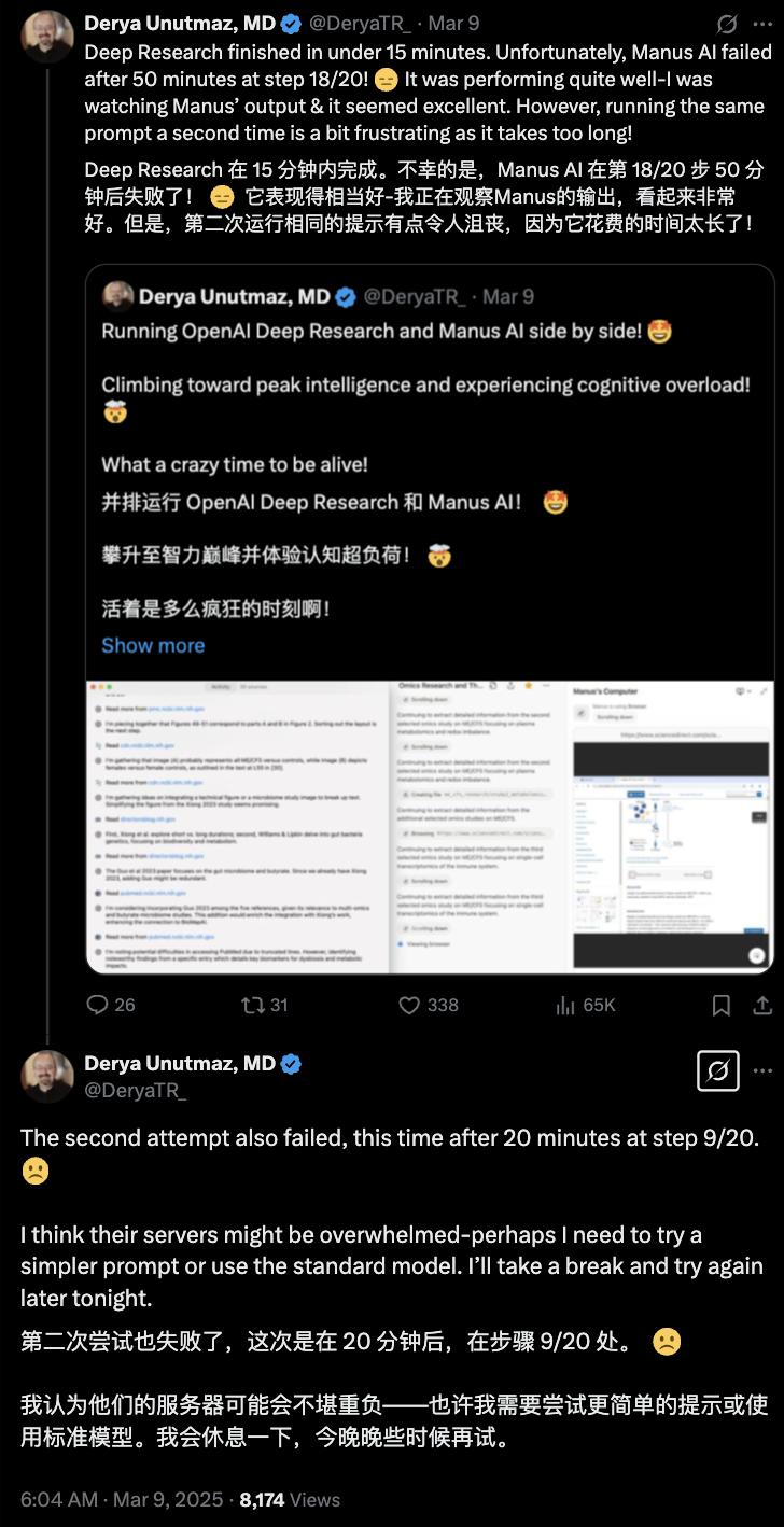 3月9日,生物医学科学家Derya Unutmaz连续发布几篇推文,他同时运行Manus和OpenAI Deep Research进行对比。
