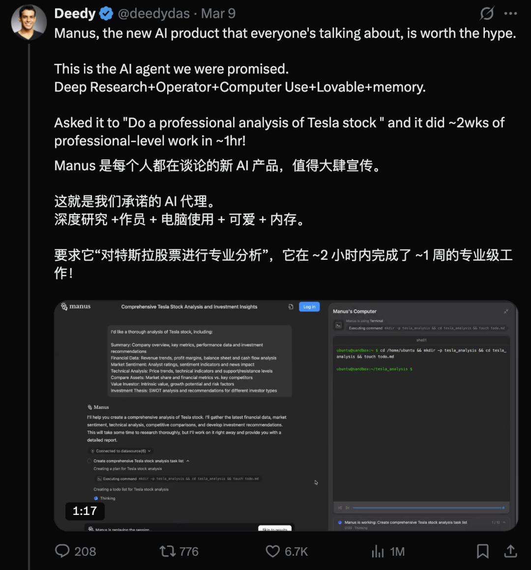 3月9日,AI搜索创企Glean创始团队之一的Deedy发文,他让Manus“对特斯拉股票进行专业分析”,Manus在大约2小时内完成将近一周的专业级工作。截至3月10日14点,这篇推文的阅读量已经超过110万,点赞数达到7100。