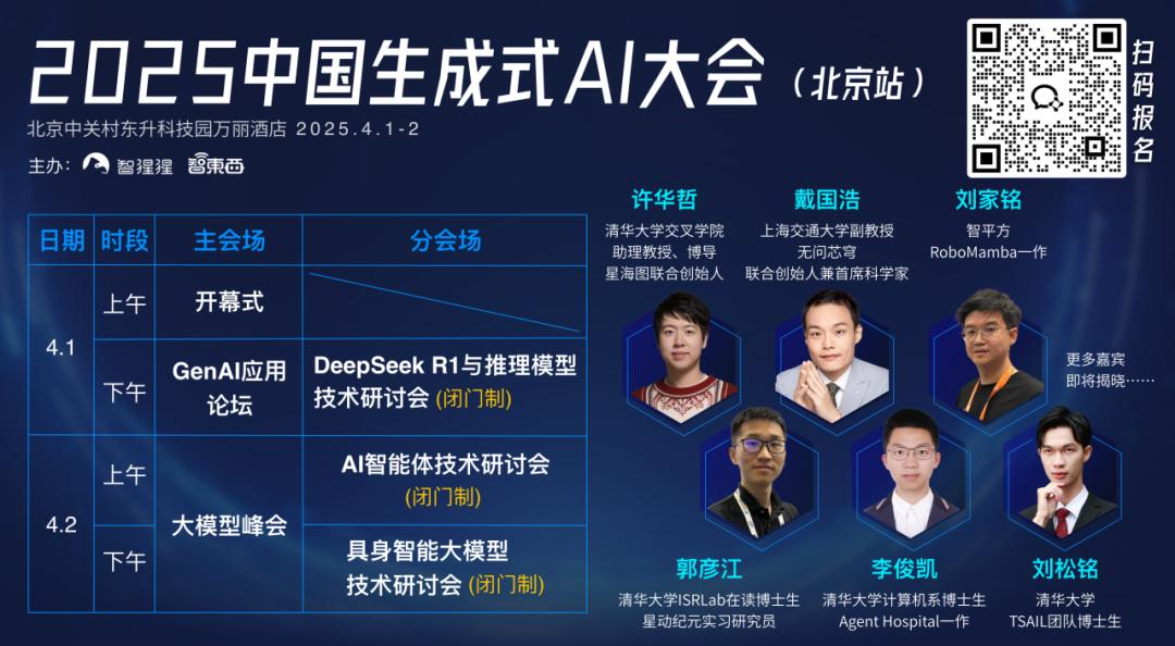 4月1-2日,智东西联合主办的2025中国生成式AI大会(北京站)将举行。20+位嘉宾/企业已确认,将围绕DeepSeek、大模型与推理模型、具身智能、AI智能体与GenAI应用带来分享和讨论。更多嘉宾陆续揭晓。欢迎报名~