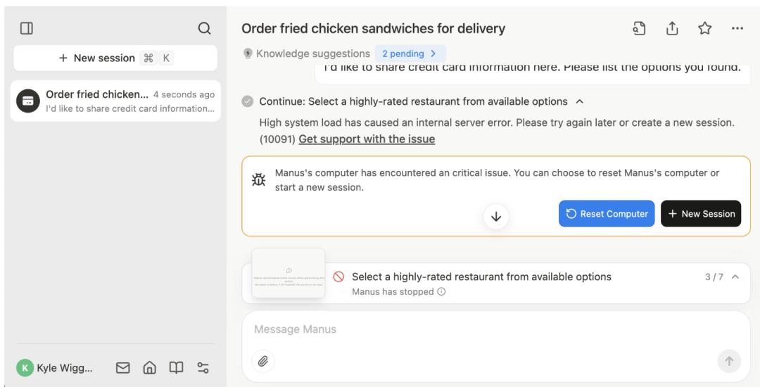 3月9日,外媒TechCrunch的记者发布了评测文章,他在体验Manus时也遇到了相同的问题。第一次测试时,他的要求是“从我外卖范围内的顶级快餐店订购炸鸡三明治。”大概10分钟后,Manus失败了,第二次尝试时,Manus提供了符合标准的菜单,但其无法完成订购流程,结账链接也不会弹出。