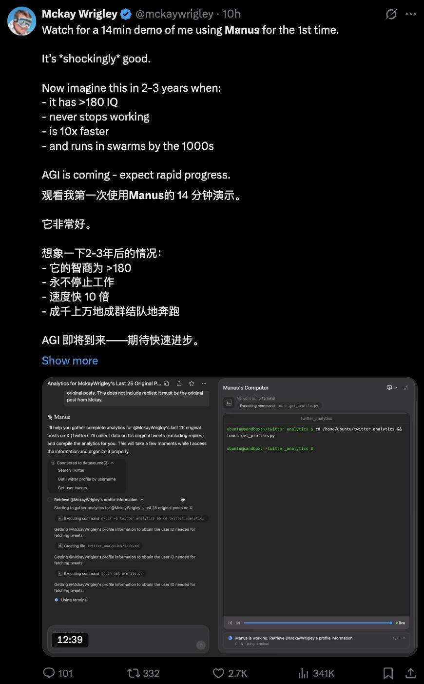 3月10日凌晨,AI工具TakeoffAI创始人Mckay Wrigley发文,发布了他体验Manus的14分钟视频,并认为“AGI即将到来”。截至3月10日14点,这条推文阅读量已经超过44.9万,点赞量超3100。