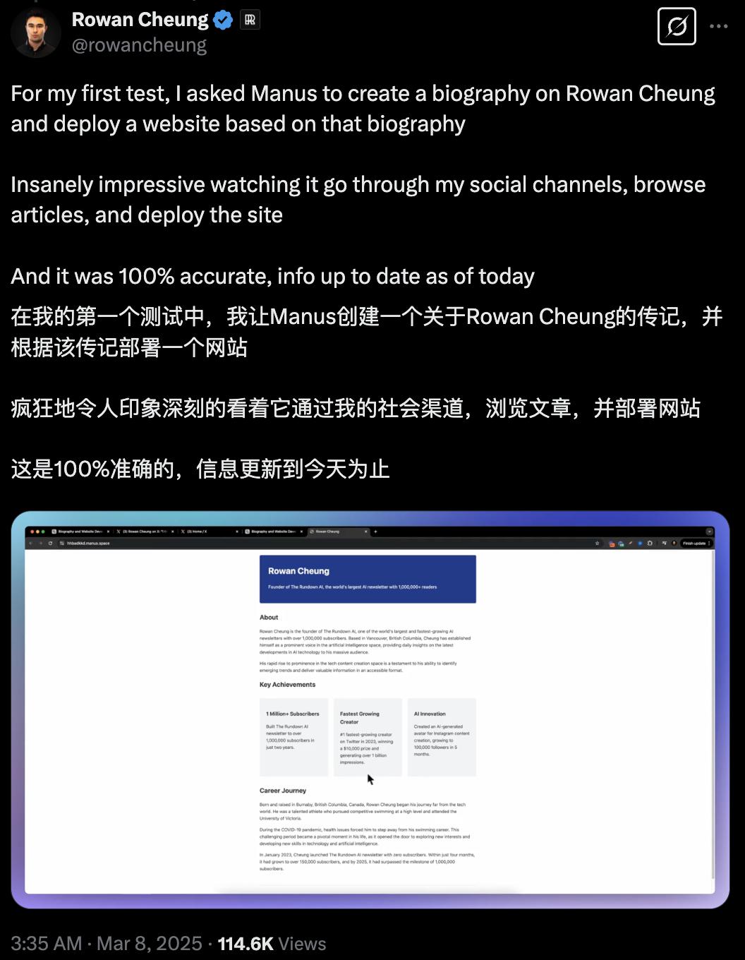 3月8日,Rowan Cheung拿到Manus的第一个测试就是生成自己的传记,在推文中他说道,Manus可以通过他的社交平台浏览文章并部署网站,然后生成日期更新到今天且100%正确的内容。