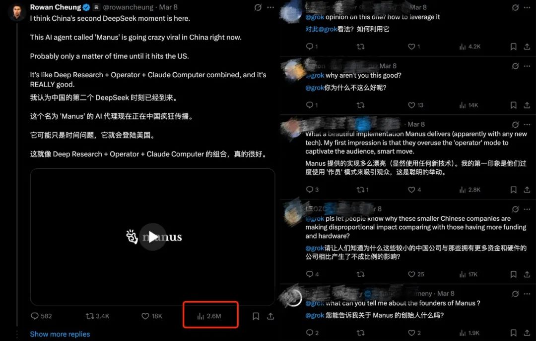 其中,头部科技博主Rowan Cheung转发Manus发布视频的推文观看量最高,已破260万。评论区网友最关注的话题还是“邀请码在哪领”,还有网友在评论区@Grok询问“如何得到Manus邀请码”、“Manus是什么”、“Manus怎么用”、“关于Manus创始人”、“Manus会有风险吗”等问题。