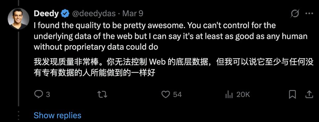 总体来看,海外不少科技博主将其直接对标OpenAI Deep Research、DeepSeek,称作“另一个DeepSeek时刻”、“AGI即将到来”、“最接近Deep Research的模型”、“最令人印象深刻的AI工具”。