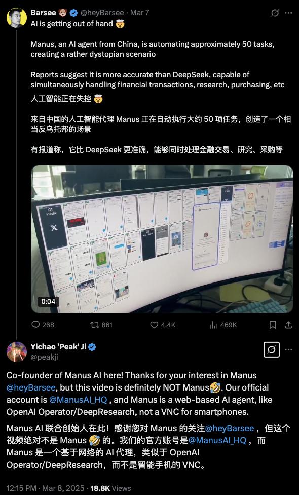这则推文发布一天后,3月9日,Manus联合创始人兼首席科学家季逸超辟谣“这个视频绝对不是Manus的”。他说:“Manus是一个基于网络的AI智能体,类似于OpenAI Operator/DeepResearch,而不是智能手机的VNC。”