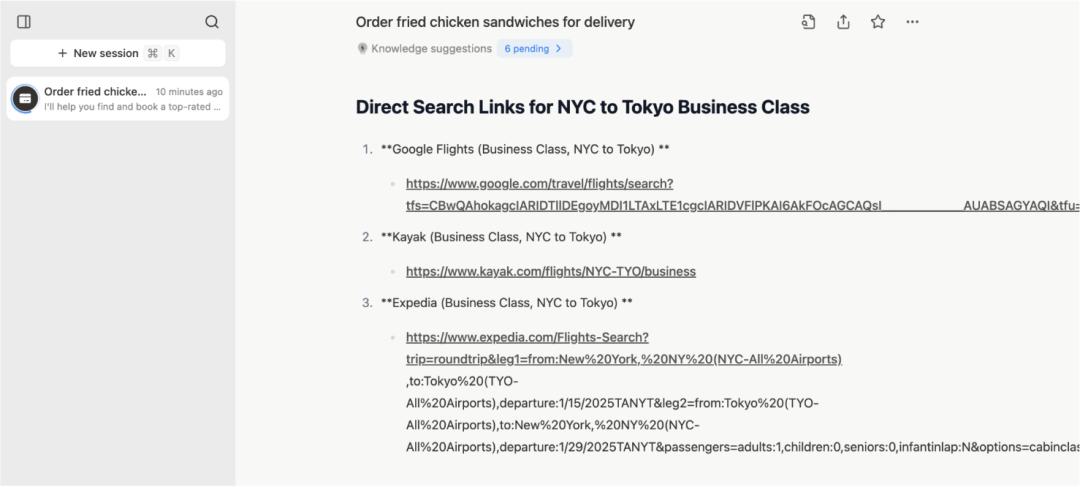 另一个要求是让Manus预定从纽约到日本的航班,Manus能做的最好的事情就是在几个航空公司网站和机票搜索引擎上提供票价链接,不过其中一些链接已经无法打开了。