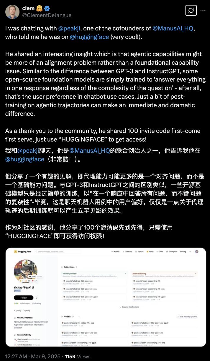 Manus一码难求的当下,3月9日,Hugging Face创始人Clément Delangue发文称,他与Manus联合创始人兼首席科学家季逸超进行了交流,为了感谢Hugging Face,季逸超在社区内分享了100个邀请码。