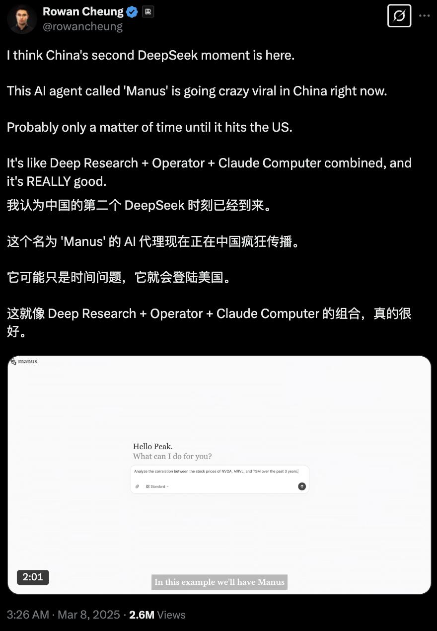 3月8日,Rowan Cheung连发了7篇推文晒出自己的体验用例,称赞“中国的第二个DeepSeek时刻已经到来”,认为Manus“就像Deep Research+Operator+Claude Computer的组合”。截至3月10日14点,他最热门的推文阅读量已经超过260万,点赞量达1.8万。