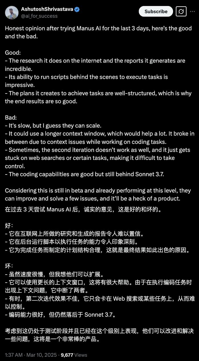 TechCrunch引用了AI博主Ashutosh Shrivastave的总结,Manus好的地方在于可以生成基于互联网信息的研究和报告,在后台运行脚本以执行任务的能力、为完成任务而制定的计划结构合理;不好的地方在于,运行速度慢,有时会卡在搜索或某些任务上,从而难以控制,编码能力落后于Claude Sonnet 3.7。