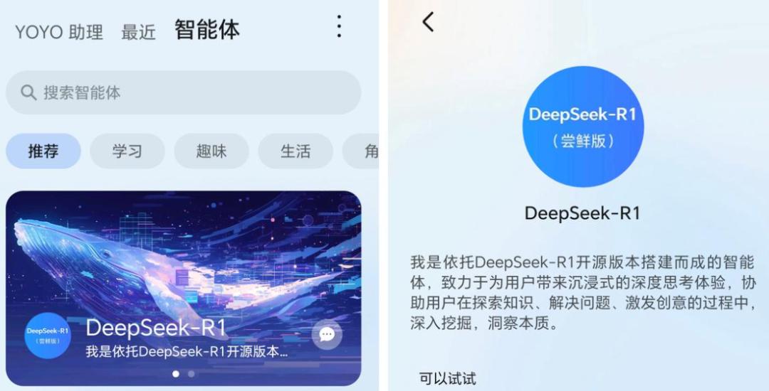 三是“智囊团”。这种接入模式中,手机厂商对自家AI更重视,用户需要DeepSeek的话就去请外援,平时还是自家AI挑大梁。比如鸿蒙NEXT系统的小艺助手接入DeepSeek-R1,就是通过小艺助手App的智能体广场来调用,相当于外部合作的“智囊团”,核心AI能力来自自研的盘古大模型。