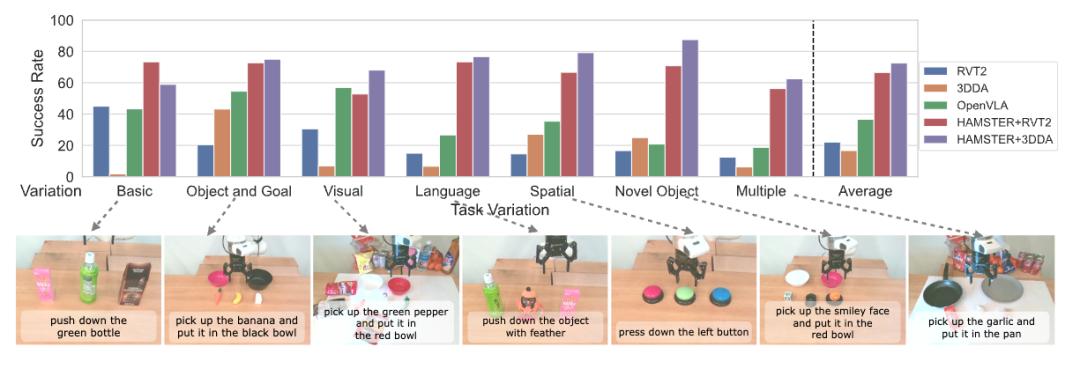 研究团队在模拟环境与真实机器人平台上对 HAMSTER 进行了多组测试,涵盖多种类型的操作任务(如抓取、放置、推、按压等),并在不同的视觉和指令变化条件下,验证其泛化性能。