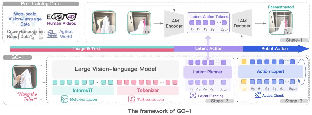 如果说Manus代表了人工智能在工具化应用上的突破,那么智元机器人发布的GO-1则是具身智能领域的一次重大飞跃。GO-1是全球首个通用具身基座大模型,它开创性地提出了Vision-Language-Latent-Action(ViLLA)架构。这一架构由VLM(多模态大模型)和MoE(混合专家)组成,通过深度学习和生成式人工智能技术,实现了视觉、语言和动作的深度融合。