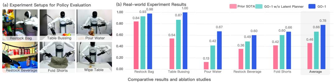 ViLLA架构的核心在于弥合图像-文本输入与机器人执行动作之间的鸿沟。与传统的Vision-Language-Action(VLA)架构相比,ViLLA通过引入Latent Action Tokens(隐式动作标记),显著提升了模型的动作规划和执行能力。在实验中,GO-1在五种不同复杂度的任务上表现卓越,成功率比现有最优模型提高了32。