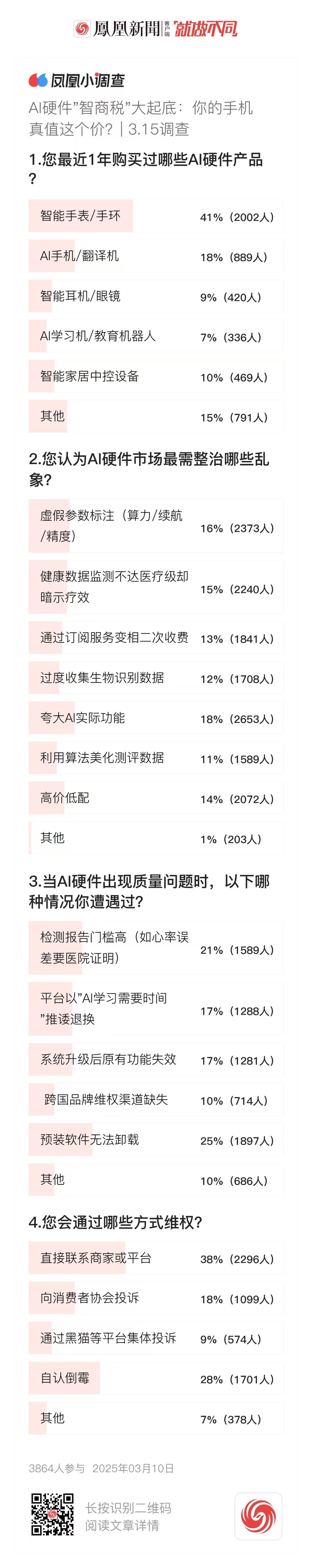 凤凰网科技讯 3月10日,随着人工智能硬件产品的普及,消费者对其性能和市场乱象的关注日益增加。在“3·15消费者权益保护日”即将到来之际,凤凰网科技针对AI硬件市场进行了一项调查,以了解消费者对AI硬件产品的购买情况、遇到的问题以及维权方式。共有3864位网友参与了此次调查。
