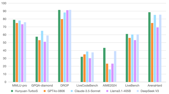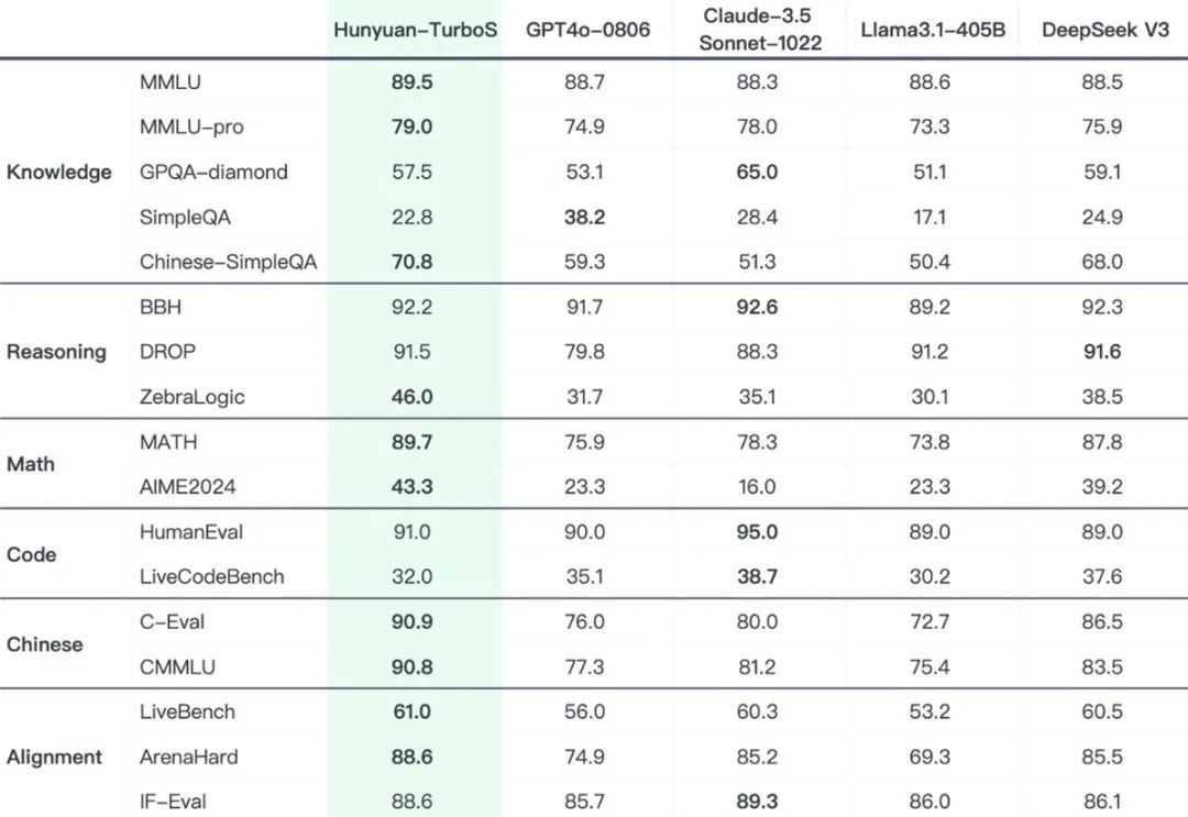 官方数据显示,Hunyuan-TurboS在多个关键benchmark上表现出色: