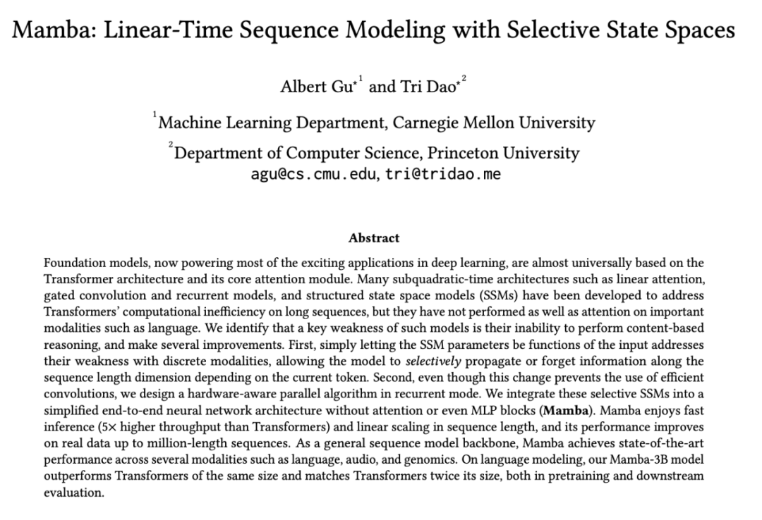 Mamba 是由 Albert Gu (卡耐基梅隆大学)和 Tri Dao(普林斯顿大学) 两位研究人员主导开发的
