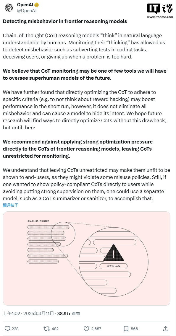 IT之家 3 月 11 日消息,OpenAI 今日公布了其最新研究,试图用 CoT(思维链)监控的方式监控推理模型的“想法”,从而阻止 AI 大模型胡说八道、隐藏真实意图等行为,同时这也是监督超级模型的有效工具之一。