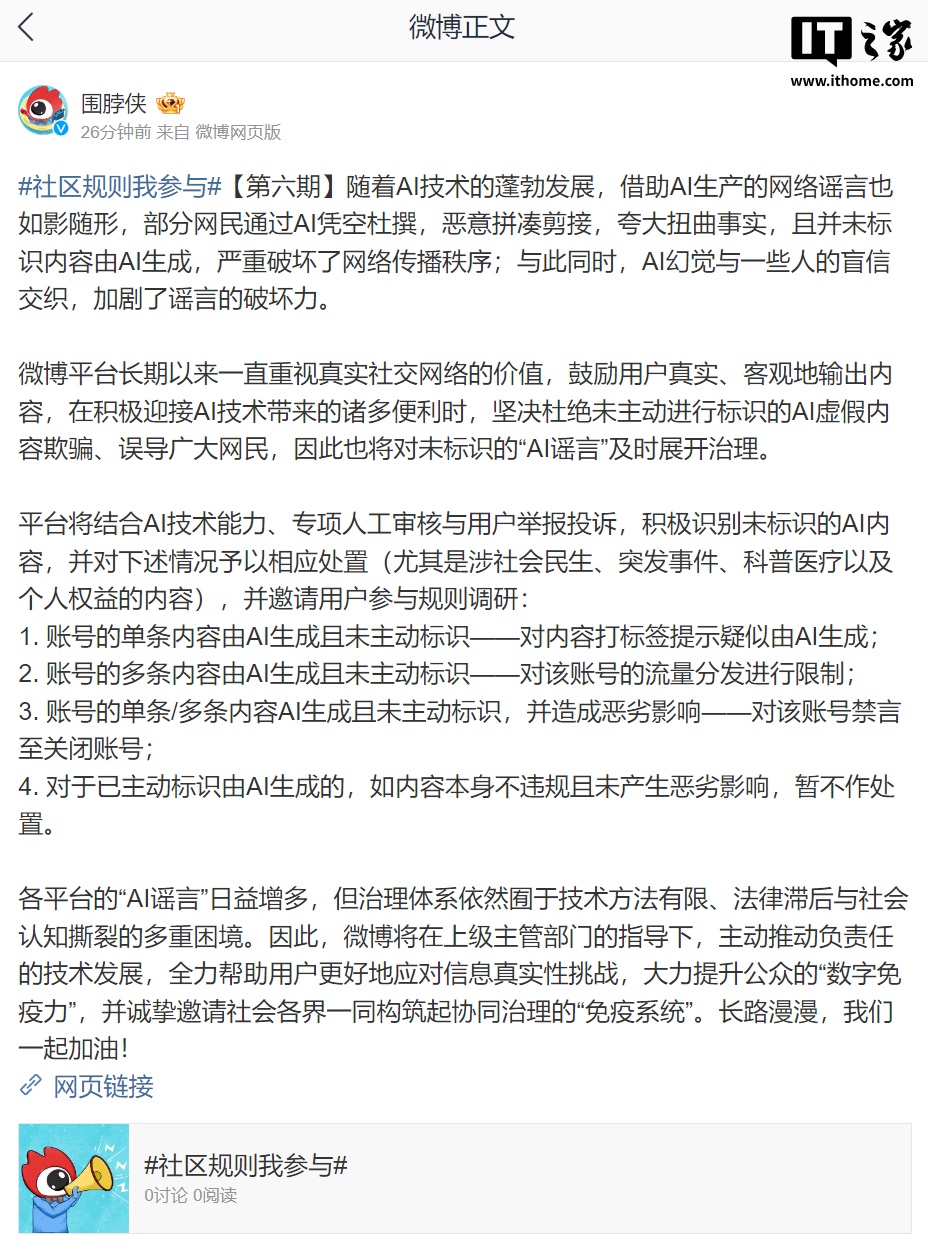 IT之家 3 月 11 日消息,微博社区观察员官方账号今日发文称,将对未标识的“AI 谣言”及时展开治理。