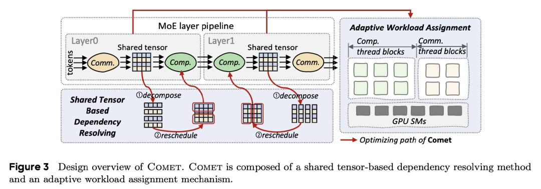 Comet 则通过两项关键设计实现了通信与计算的细粒度重叠:1. 通过识别 MoE 中通信和计算操作之间的复杂数据依赖关系,优化计算通信管道的结构;2. 通过动态分配 GPU 线程块来平衡通信和计算工作负载,提高延迟隐藏效率。