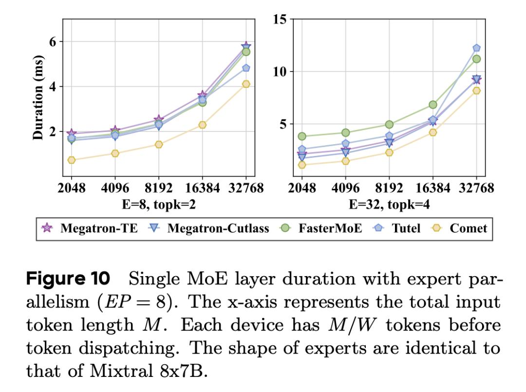 与 Megatron-Cutlass、Megatron-TE、FasterMoE 和 Tutel 相比,Comet 的端到端延迟分别降低了 34.1%、42.6%、44.4% 和 31.8%。