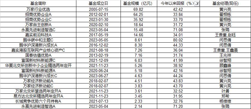 华夏北交所创新中小企业精选两年定开作为2023年冠军基金,年内表现依旧稳定,今年涨幅接近40%。而在体量较大的产品中,万家基金黄兴亮管理的万家行业优选,则以42.42%净值增长排名靠前。