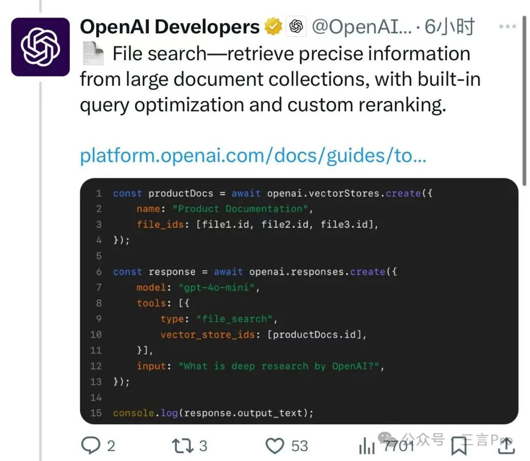 开发人员现在可以使用改进的文件搜索工具轻松地从大量文档中检索相关信息。它支持多种文件类型、查询优化、元数据筛选和自定义重新排名,可以提供快速、准确的搜索结果。