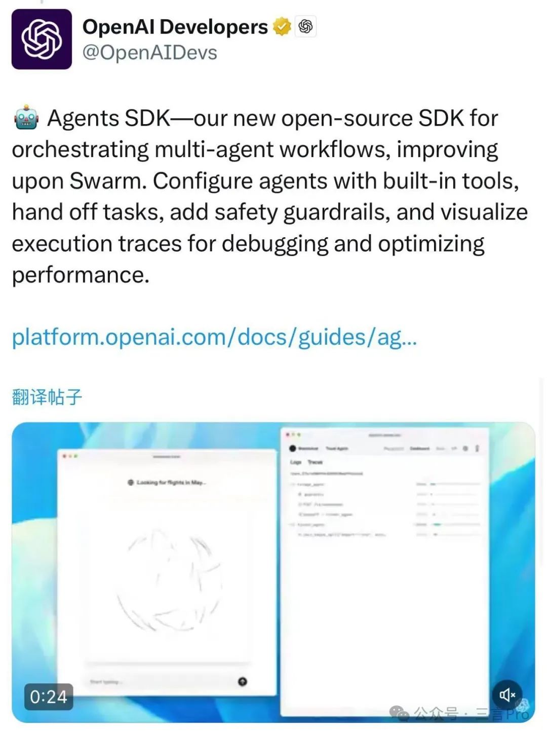 Agents SDK — 用于协调多代理工作流的全新开源 SDK,在 Swarm 的基础上进行了改进。使用内置工具配置代理、交接任务、添加安全护栏,并可视化执行轨迹以进行调试和优化性能。