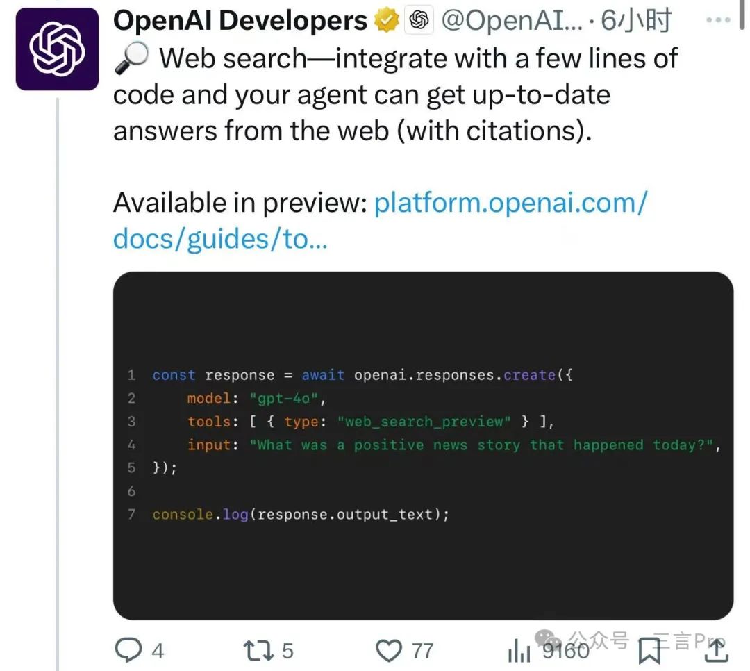 其中,网络搜索允许开发人员从 Web 获得快速、最新的答案,并提供清晰且相关的引用。在响应API中,使用gpt-4o和gpt-4o-mini时,Web搜索可用作工具,并且可以与其他工具或函数调用配对。