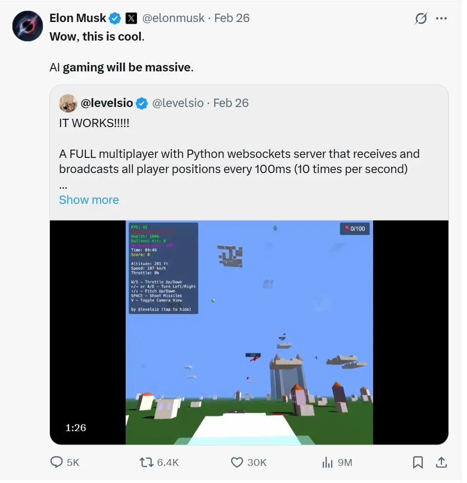 也有人靠此赚到了真金白银的收益。海外一位叫 Pieter Levels 的大神只用了 3 个小时,完全依靠 AI 开发了一款游戏。上线 13 天已经赚了 67,000 美元,折合人民币接近 50 万元,马斯克都为此点赞!