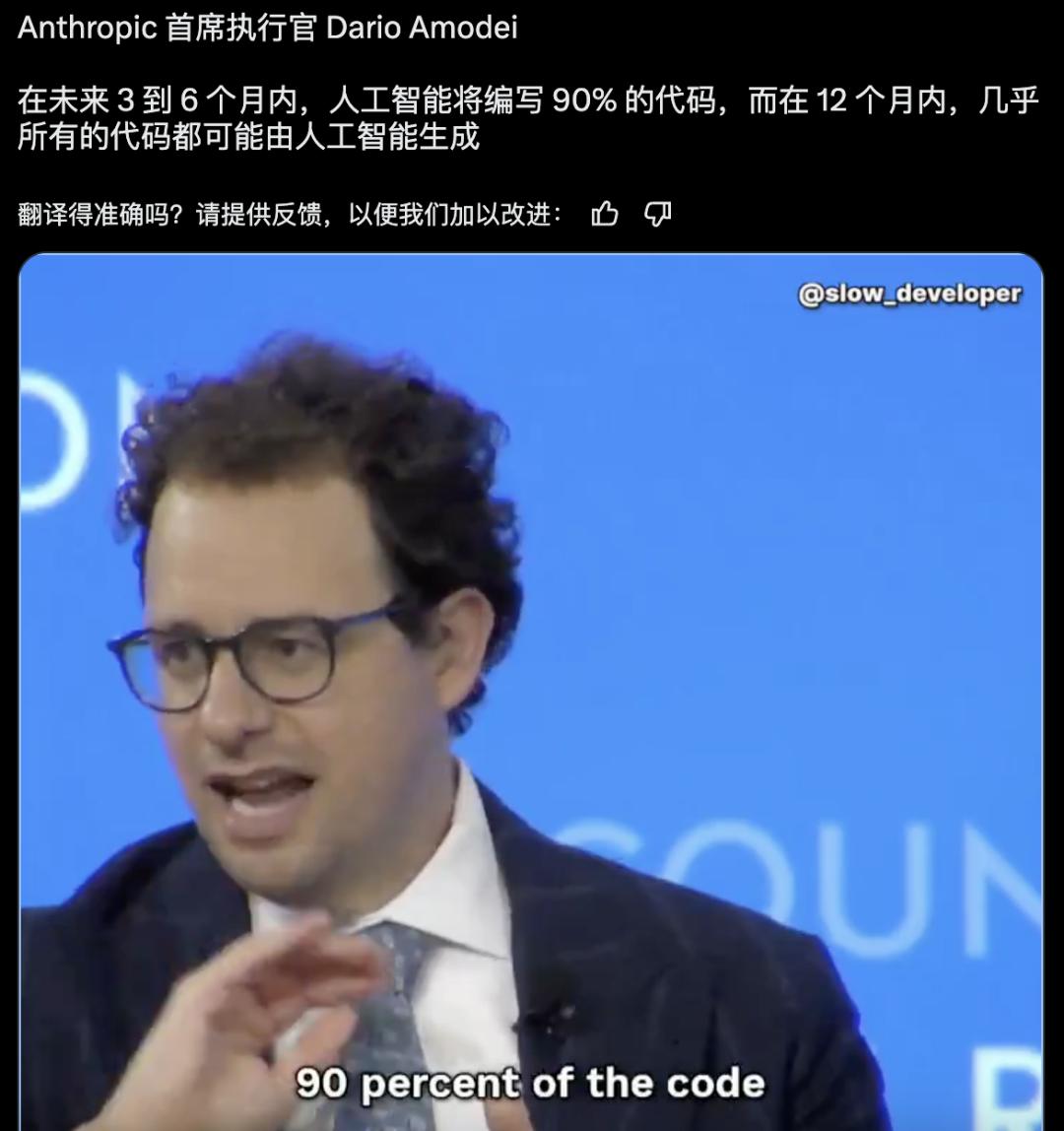 最新消息,Anthropic首席执行官Dario Amodei更在近日直言:未来3到6个月,AI将编写90%的代码,而在12个月内,几乎所有的代码都可能由AI编写。