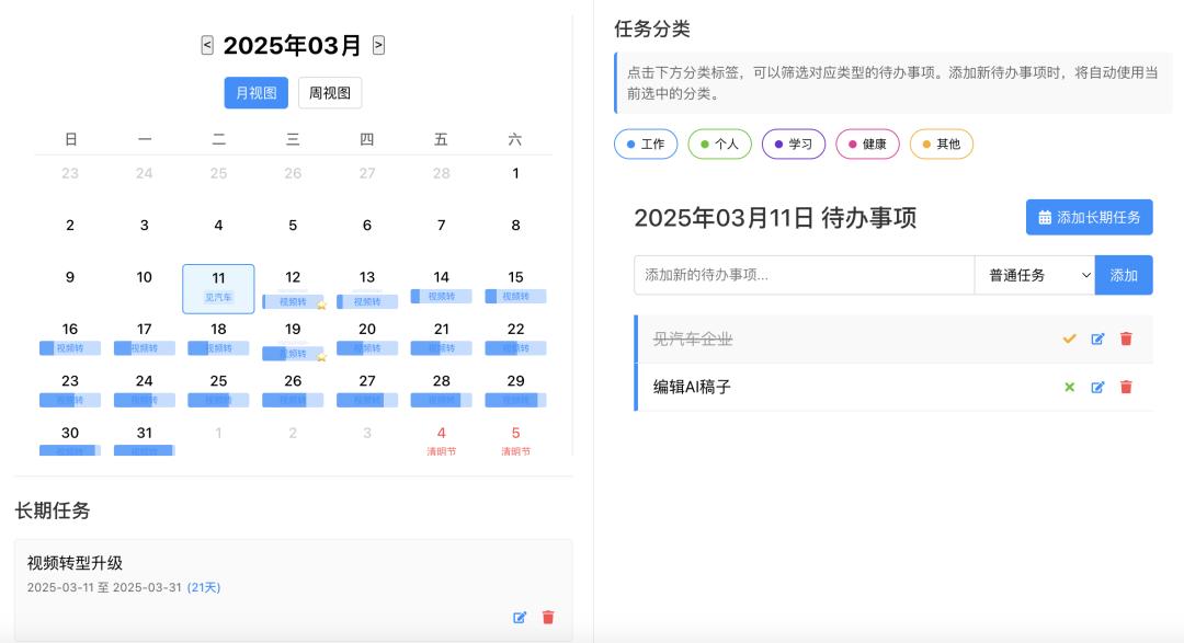 第三是长短期任务结合,都可以添加和显示,尤其长期任务是每天显示进度,起到很好的督促作用。