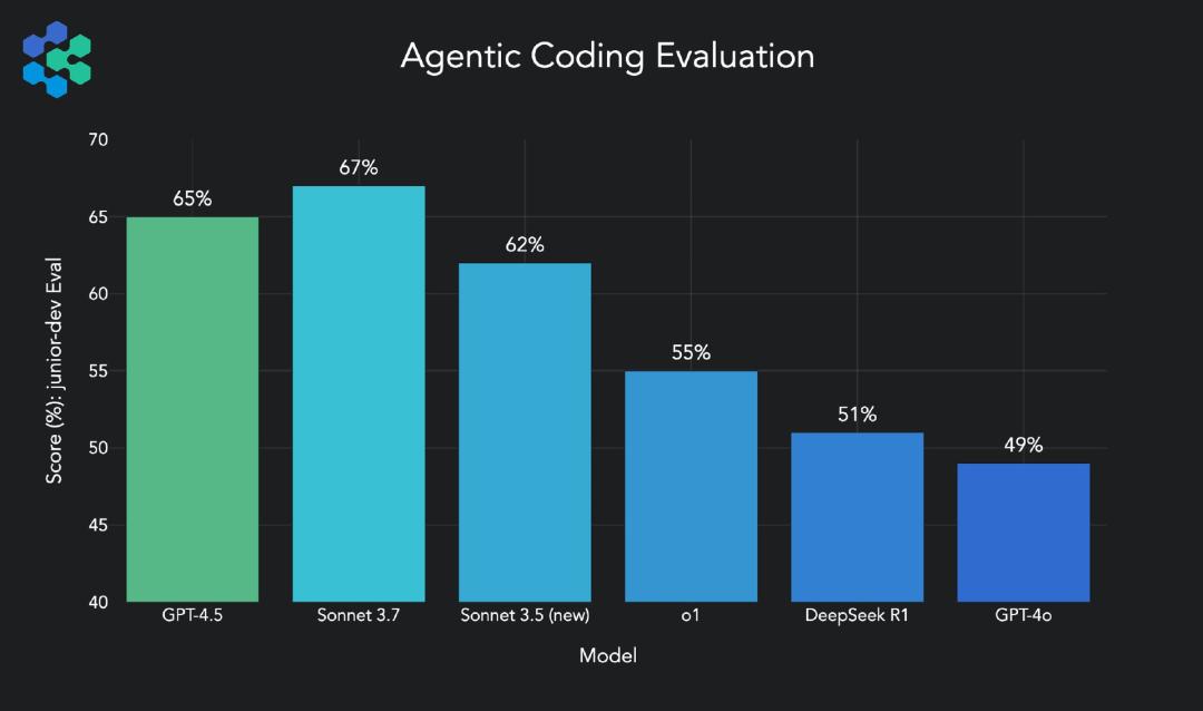 重点提及下,最新的Agentic Coding Evalution榜单中,Sonnet 3.7 以67%的得分率,在初级人员开发评估达成度中位列所有模型第一。第二三名中GPT-4.5和Sonnet 3.5也相差相差无几,都超过了60%。显示了这几款模型的编程能力强大。