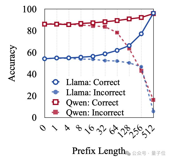 研究者们通过实验发现,不同模型在解题路径前半部分的长度(即“前缀”长度)对准确性的影响比较鲁棒。