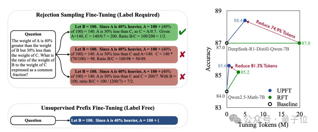 基于这一发现,团队尝试仅微调模型生成的前8-32个词,结果其推理能力果真可达到与传统监督训练相当的水平。